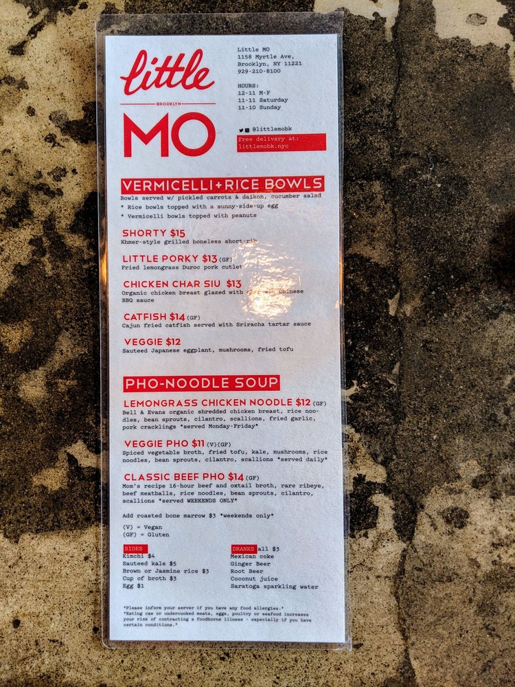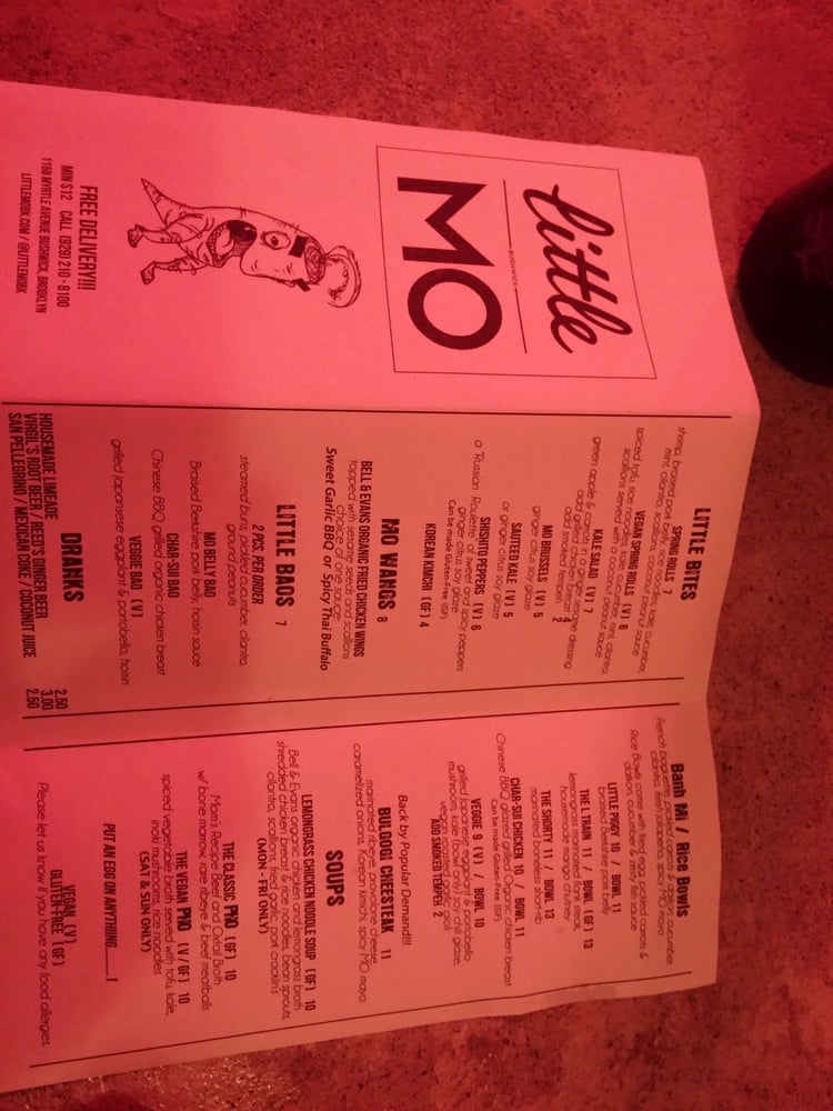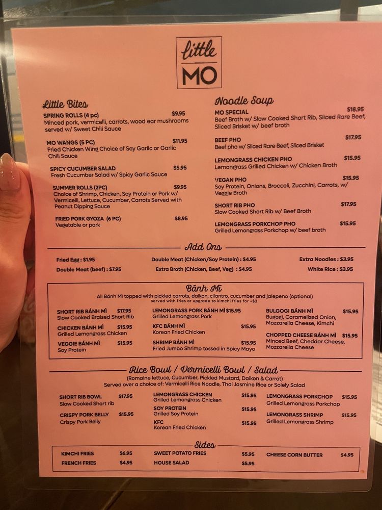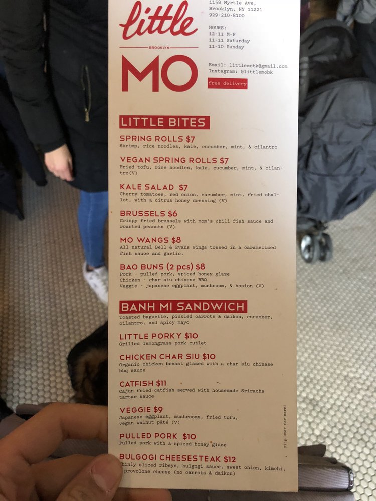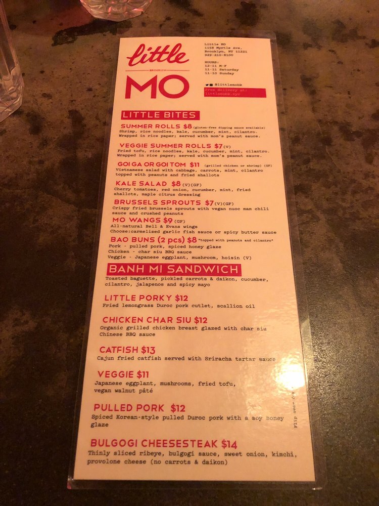 Little Mo is a Vietnamese and Asian fusion restaurant located in Brooklyn, NY. They offer a variety of dishes such as pho, banh mi sandwiches, salads, and appetizers with both vegetarian and non-vegetarian options. Customers praise the freshness and flavors of the food, especially highlighting the Mo Special Pho, bulgogi banh mi, crispy cajun fish banh mi, and the chicken wings. The restaurant offers a modern, trendy ambiance with options for outdoor seating, private dining, and catering services. Little Mo is known for its prompt service and friendly staff, with patrons commending servers like Leo for their attentiveness and enthusiasm. Overall, Little Mo is a hidden gem that provides a memorable dining experience with authentic Vietnamese flavors and a modern twist.