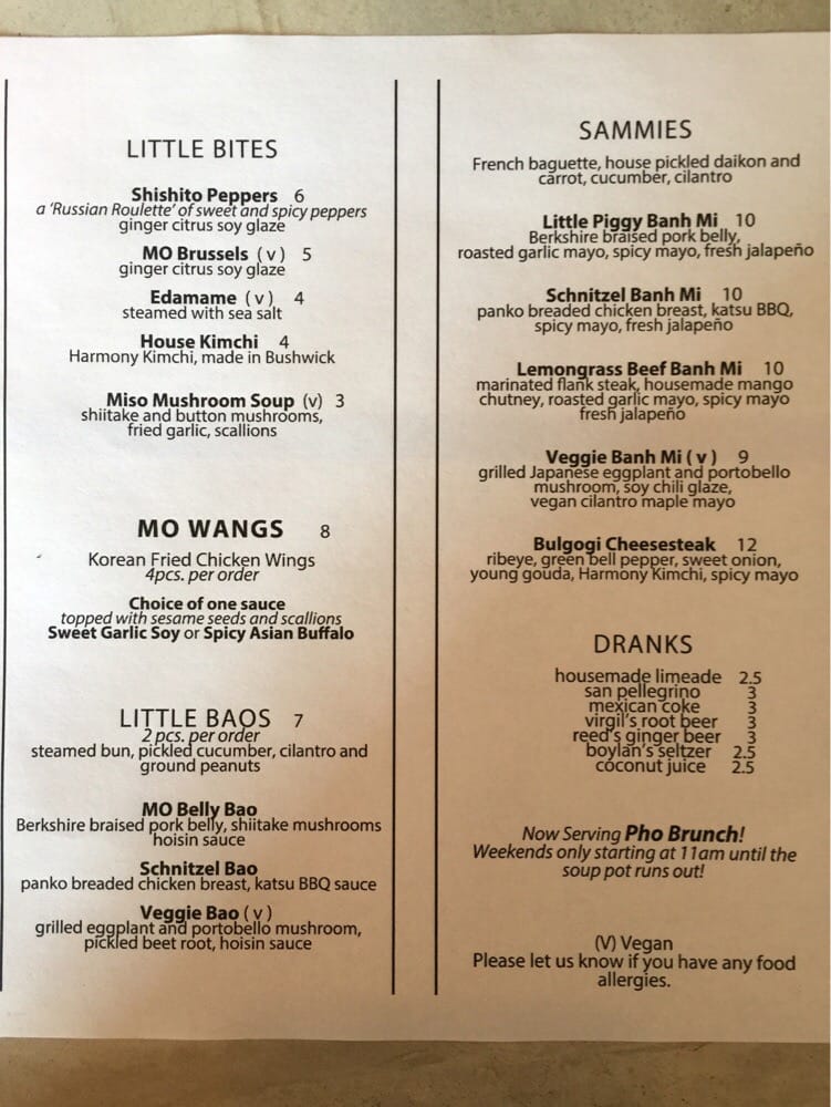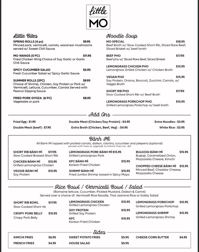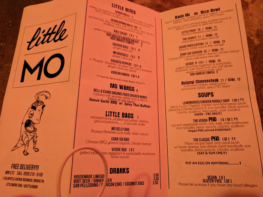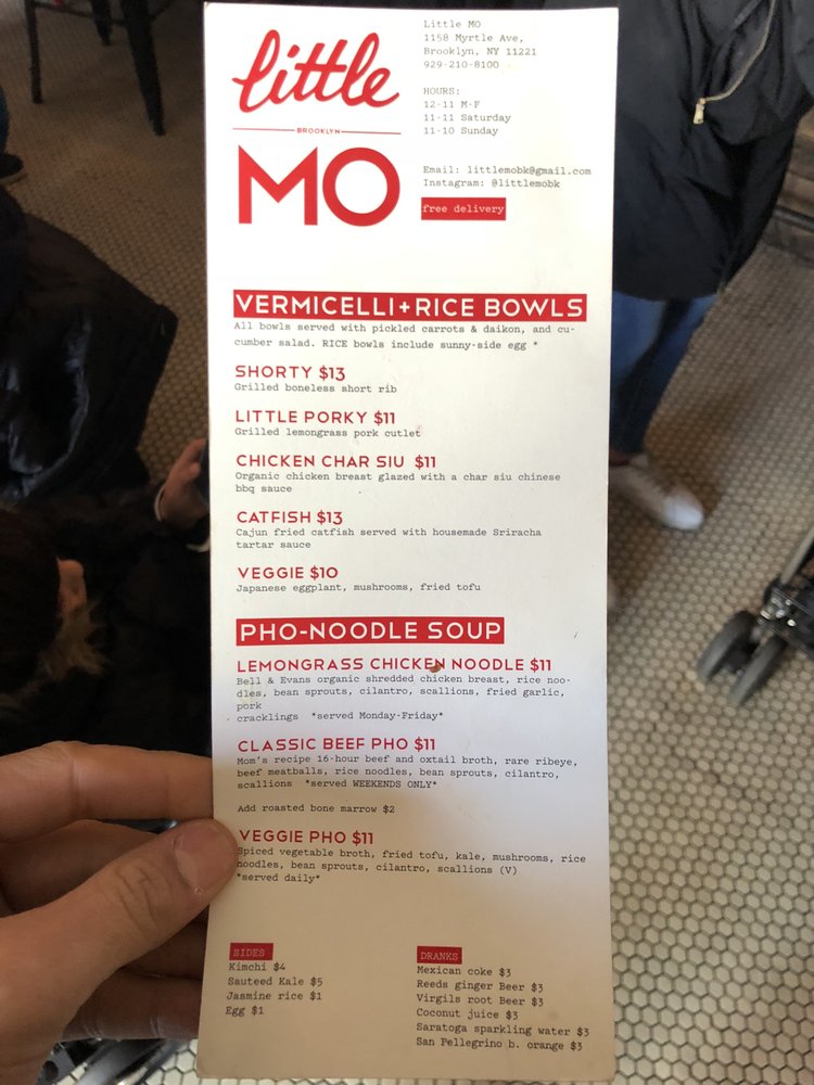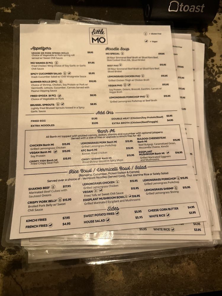 Little Mo is a Vietnamese and Asian fusion restaurant located in Brooklyn, NY. They offer a variety of dishes such as pho, banh mi sandwiches, salads, and appetizers with both vegetarian and non-vegetarian options. Customers praise the freshness and flavors of the food, especially highlighting the Mo Special Pho, bulgogi banh mi, crispy cajun fish banh mi, and the chicken wings. The restaurant offers a modern, trendy ambiance with options for outdoor seating, private dining, and catering services. Little Mo is known for its prompt service and friendly staff, with patrons commending servers like Leo for their attentiveness and enthusiasm. Overall, Little Mo is a hidden gem that provides a memorable dining experience with authentic Vietnamese flavors and a modern twist.